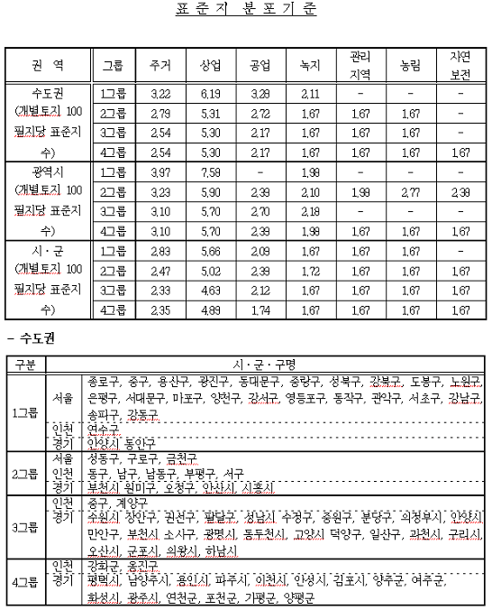 ±âÁ¸ ÁöħÀº ´ëÇ¥¼º ¡¤ Á߿뼺 ¡¤ ¾ÈÁ¤¼º ¡¤ È®Á¤¼ºÀ̶ó´Â Ç¥ÁØÁö ¼±Á¤ÀÇ 4´ë ¿øÄ¢¿¡ ´ëÇÑ ±âÁØÀÌ ´Ù¼Ò Ãß»óÀûÀ̾ú°í, Àü±¹ 244°³ ½Ã ¡¤ ±º ¡¤ ±¸ÀÇ Ç¥ÁØÁö ¹èºÐÀº Áö¿ªÆ¯¼ºÀ» °¨¾ÈÇÏÁö ¾Æ´ÏÇÏ°í ´Ü¼ø ÇàÁ¤±¸¿ªÀ§ÁÖ·Î ÀÌ·ç¾îÁ® °³º°°ø½ÃÁö°¡ »êÁ¤½Ã ºñ±³Ç¥ÁØÁö·Î¼ Ȱ¿ë¿¡ ºÎÁ¤ÀûÀÎ ¿µÇâÀ» ÁÖ¾î ¿Ô´Ù. ¶ÇÇÑ ±Ý¹ø ±¹ÅäÀǰèȹ¹×À̿뿡°üÇѹý·ü(ÀÌÇÏ ¡°±¹Åä°èȹ¹ý¡±À̶ó ÇÑ´Ù)ÀÇ Á¦Á¤¿¡ ÀÇÇÑ ¿ëµµÁö¿ª ü°è °³Æí µî¿¡ µû¶ó Ç¥ÁØÁö ¼±Á¤ÀÇ ¸íÈ®ÇÑ ±âÁØÀ» Á¦½ÃÇϰí Ç¥ÁØÁö ºÐÆ÷¹Ðµµ¸¦ ÀçÁ¶Á¤ÇÒ Çʿ伺ÀÌ Á¦±âµÇ¾ú´Ù.