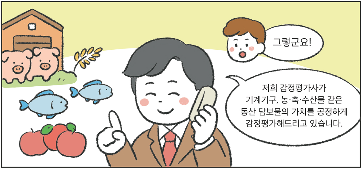 가치평가 전문가인 감정평가사는 「감정평가 및 감정평가사에 관한 법률」등에 따라 토지 및 그 정착물, 동산, 그 밖에 대통령령으로 정하는 재산과 이들에 관한 소유권 외의 권리를 감정평가할 수 있습니다. 또한, 기계기구, 농·축·수산물 등의 동산은 「동산·채권 등의 담보에 관한 법률」등에 따라 담보물로 설정할 수 있습니다. 한국감정평가사협회는 「감정평가 실무매뉴얼 동산담보편」(2021년 개정)을 발간하는 등 공정한 감정평가를 위해 노력하고 있습니다.