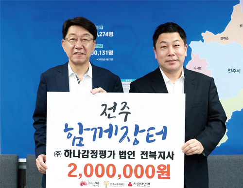 ㈜하나감정평가법인 김창배 전북지사 대표는 “전주시가 지역경제와 사회적 연대를 위한 의미 있는 사업을 운영하고 있다는 점에 깊이 공감해 동참하게 됐다”며 “앞으로도 지역과 함께 성장하는 기업과 감정평가사로서 사회적 책임을 지속적으로 실천하겠다”고 밝혔습니다.