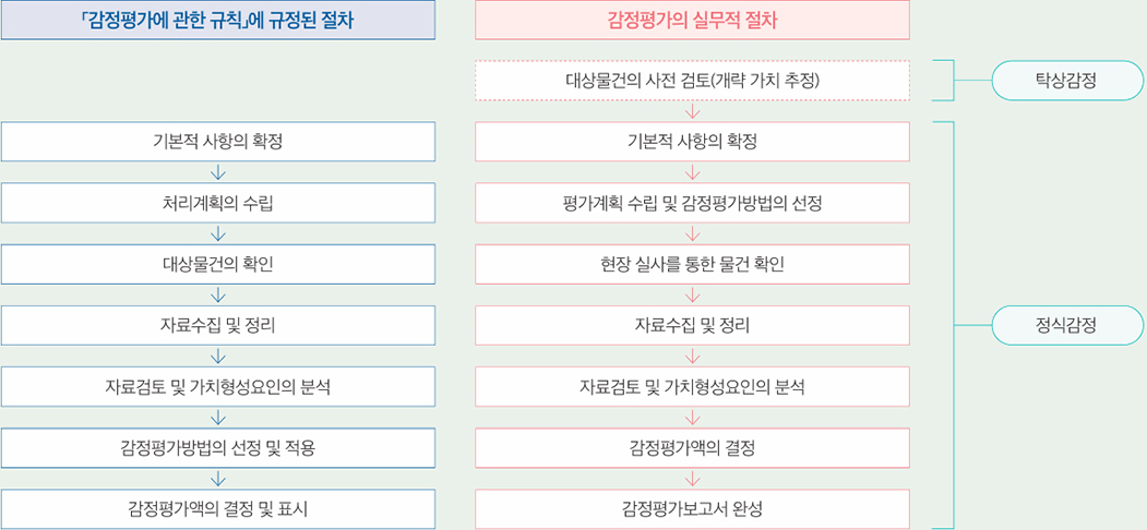 「감정평가에 관한 규칙」상의 절차와 실무 절차에서의 탁상감정과 정식감정 비교