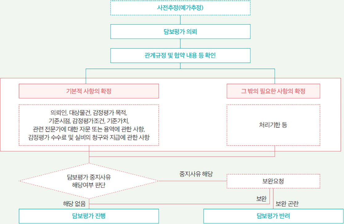금융기관의 대출업무 진행 절차도를 보면 금융기관은 차주와의 대출 상담 후 감정평가법인에 담보물에 대한 탁상감정을 의뢰한다. 탁상감정 통보 결과를 기준으로 대출 가능 여부를 판단하고 정식 감정평가를 의뢰한다.