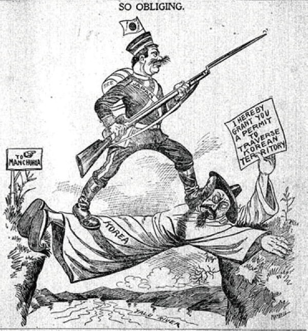 일본은 중립을 선언한 한국을 침입했고, 진해만과 서울, 인천 지역, 나아가 평양을 점령했으며, 그 점령군의 압력으로 대한제국 정부를 굴복시켜 일본의 보호국으로 향해 가는 단서가 될 의정서에 조인하도록 했다. 군사력에 의한 강제에 기초한 체결이었다.