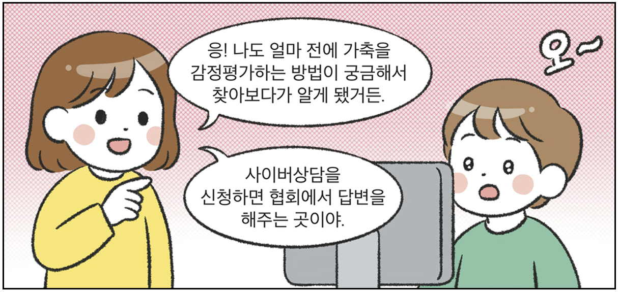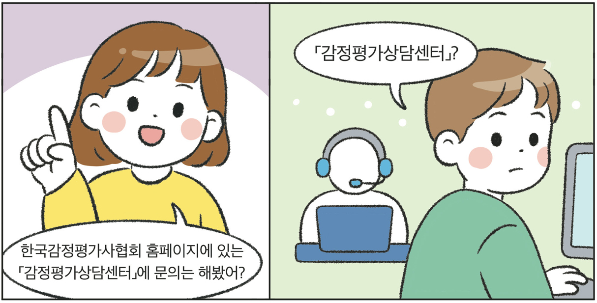 한국감정평가사협회는 감정평가 업무와 제도, 이론 등과 관련된 국민의 질의에 상담을 제공하는 「감정평가상담센터」를 운영하고 있습니다. 「감정평가상담센터」는 ‘한국감정평가사협회 홈페이지 - 사이버상담’에서 이용할 수 있습니다. 또한, 자주하는 질문(FAQ)이 정리되어 있어, 궁금한 점을 빠르게 확인할 수 있도록 하였습니다. 한국감정평가사협회는 국민 여러분의 감정평가에 대한 올바른 이해를 위해 더욱 노력하겠습니다.